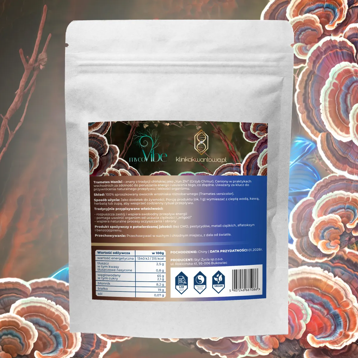 Skład: 100% sproszkowany owocnik wrośniaka różnobarwnego (trametes versicolor)